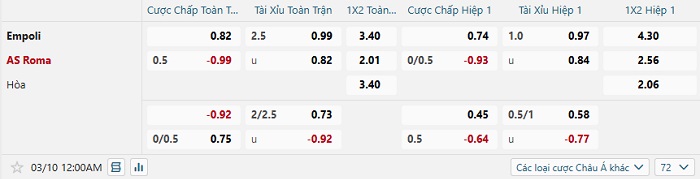 Bảng tỷ lệ kèo bóng đá Empoli vs Roma