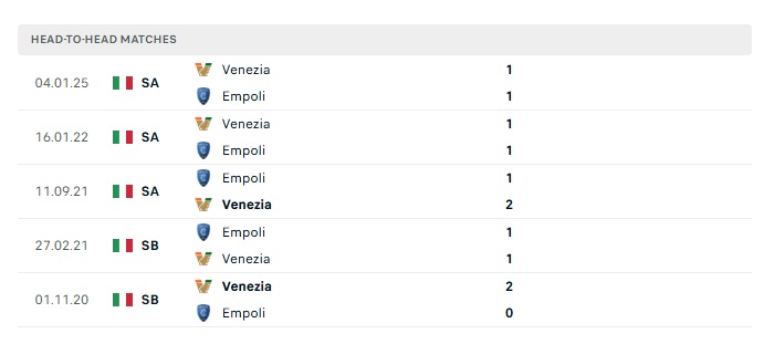 Lịch sử đối đầu Empoli vs Venezia
