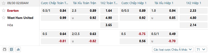 Bảng tỷ lệ kèo nhà cái Everton vs West Ham Utd