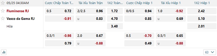 Bảng tỷ lệ kèo bóng đá Fluminense vs Vasco da Gama