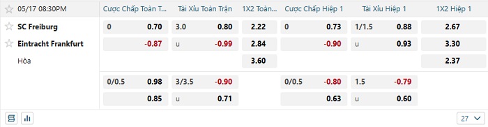Bảng tỷ lệ kèo bóng đá hôm nay Freiburg vs Ein.Frankfurt
