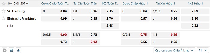 Bảng tỷ lệ kèo bóng đá hôm nay Freiburg vs Frankfurt