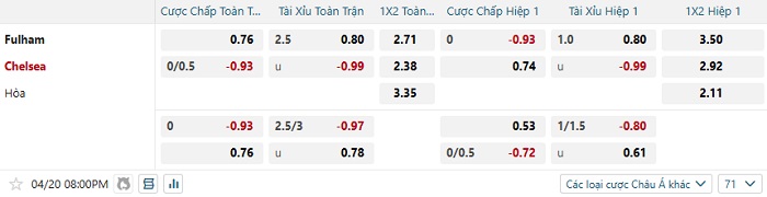 Bảng tỷ lệ kèo bóng đá Fulham vs Chelsea