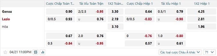 Bảng tỷ lệ kèo bóng đá Genoa vs Lazio