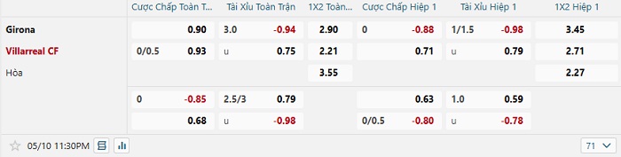 Bảng tỷ lệ kèo bóng đá hôm nay Girona vs Villarreal