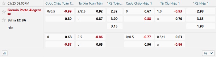 Bảng tỷ lệ kèo bóng đá hôm nay Gremio vs Bahia