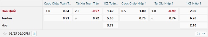 Bảng tỷ lệ kèo bóng đá Hàn Quốc vs Jordan