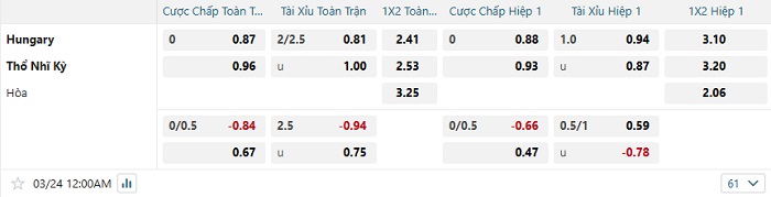 Bảng tỷ lệ kèo bóng đá Hungary vs Thỗ Nhĩ Kỳ