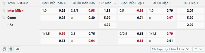 - Kèo tỷ số H1 Inter Milan vs Como: 1-0