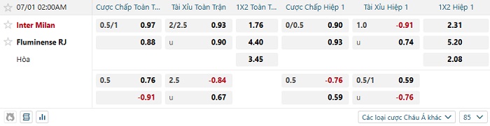 Bảng tỷ lệ kèo bóng đá Inter Milan vs Fluminense