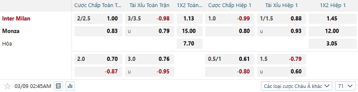 Bảng tỷ lệ kèo bóng đá Inter Milan vs Monza