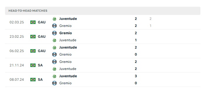 Lịch sử đối đầu Juventude vs Gremio