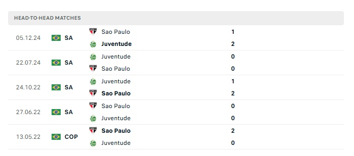 Lịch sử đối đầu Juventude vs Sao Paulo