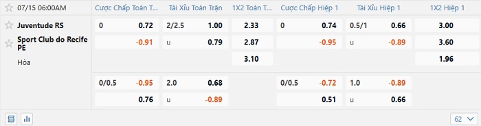 Bảng tỷ lệ kèo nhà cái Juventude vs SC Recife