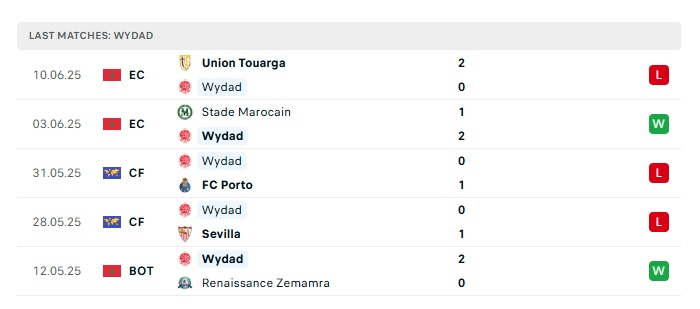 Wydad Casablanca: El Motie; Boutouil, Harkass, Boucheta, Moufid; Moubarik, Sakhi, Zemraoui; Rayhi, Mailula, Amar.