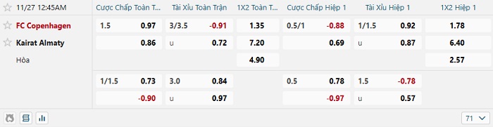 Bảng tỷ lệ kèo bóng đá Kobenhavn vs Kairat Almaty