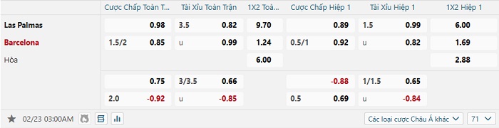Bảng tỷ lệ kèo bóng đá Las Palmas vs Barcelona