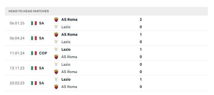 - Kèo tỷ số H2 Lazio vs Roma: 0-1