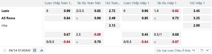 Bảng tỷ lệ kèo nhà cái Lazio vs Roma