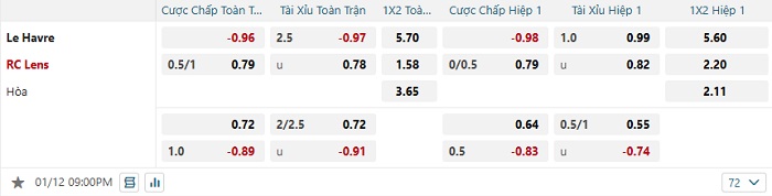 Bảng tỷ lệ kèo bóng đá Le Havre vs Lens