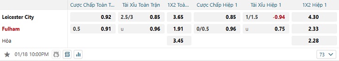 Bảng tỷ lệ kèo bóng đá Leicester City vs Fulham