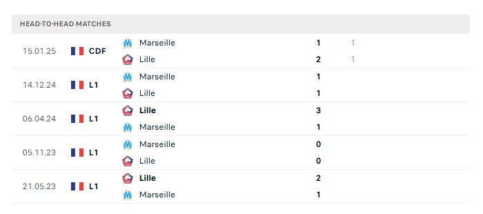 Lịch sử đối đầu Lille vs Marseille