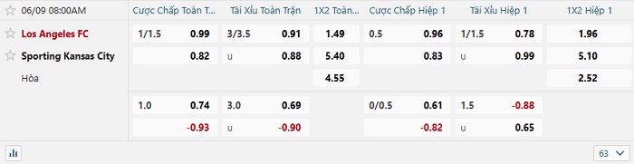 - Kèo tỷ số H1 Los Angeles FC vs Sporting Kansas: 0-0