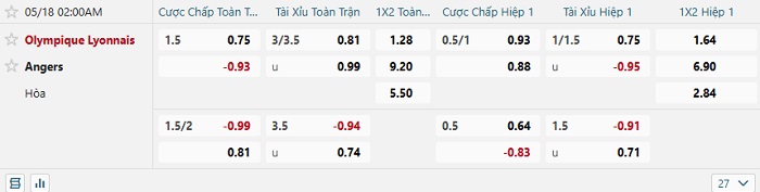 Qua một số thống kê được đưa ra, các chuyên gia đều tin vào khả năng Lyon sẽ chỉ có thể thắng tối thiểu trước đối thủ Angers. Trong 10 lần gần nhất hai đội gặp nhau, Lyon đã thắng kèo 9 và chỉ thua 1. Trong khi đó thì Angers ở 10 trận gần nhất, họ đang chỉ thắng 3 và thua đến 7. Do đó, kèo châu Âu trận đấu hôm nay sẽ khép lại với Lyon là lựa chọn tối ưu và có phần an toàn nhất.