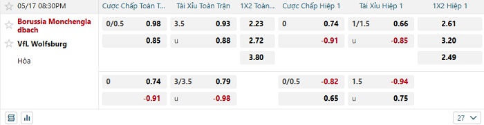 - Kèo tỷ số H1 M.gladbach vs Wolfsburg: 0-0