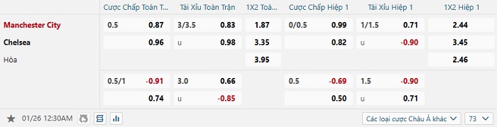 Bảng tỷ lệ kèo bóng đá Man City vs Chelsea
