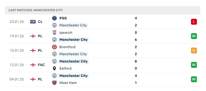 - Phong độ gần đây Man City