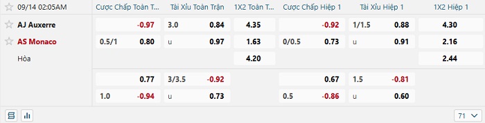 • Kèo tỷ số H1 Auxerre vs Monaco: 0-1