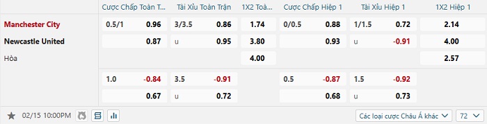 Soi kèo châu Á, kèo Man City vs Newcastle