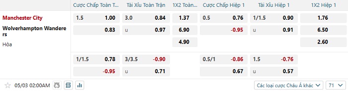 Bảng tỷ lệ kèo bóng đá Man City vs Wolves
