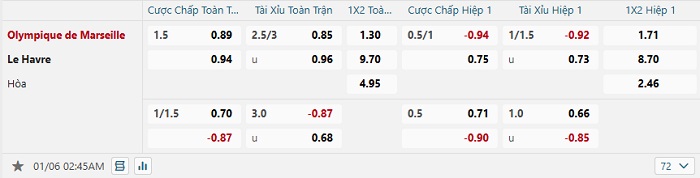 Bảng tỷ lệ kèo bóng đá Marseille vs Le Havre