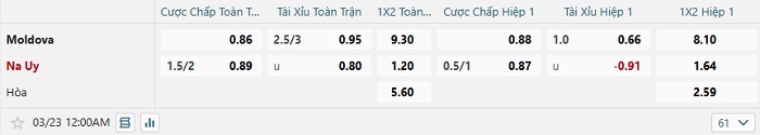 - Kèo tỷ số H1 Moldova vs Na Uy: 0-1