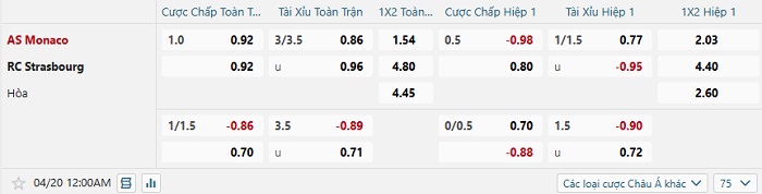 Bảng tỷ lệ kèo bóng đá hôm nay Monaco vs Strasbourg