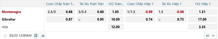 Bảng tỷ lệ kèo bóng đá Montenegro vs Gibraltar