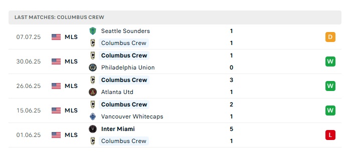 - Phong độ gần đây Columbus Crew