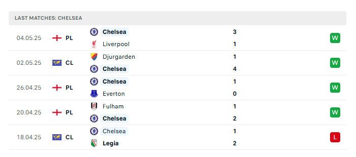 - Phong độ gần đây Chelsea