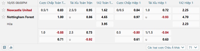 Bảng tỷ lệ kèo bóng đá Newcastle vs Nottingham Forest