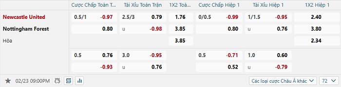 Bảng tỷ lệ kèo bóng đá Newcastle vs Nottingham Forest
