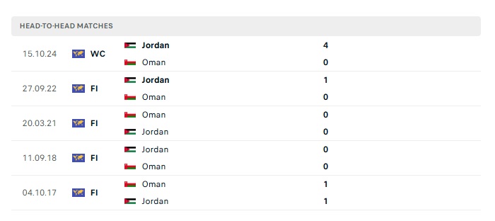 Lịch sử đối đầu Oman vs Jordan