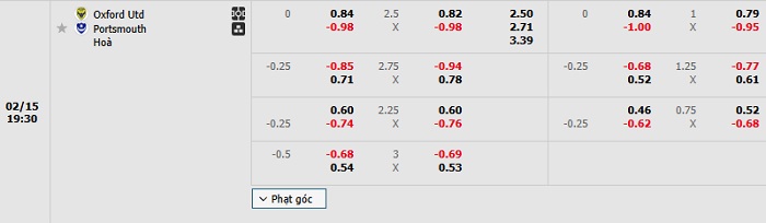 Bảng tỷ lệ kèo bóng đá Oxford Utd vs Portsmouth