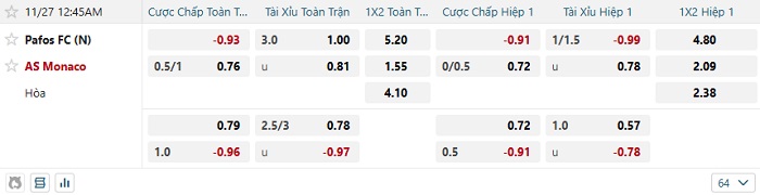 Bảng kèo bóng đá Pafos FC vs Monaco