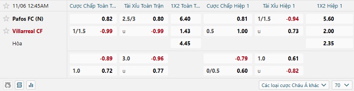 - Kèo tỷ số H1 Pafos FC vs Villarreal: 0-0