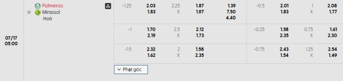Bảng tỷ lệ kèo bóng đá hôm nay Palmeiras vs Mirassol