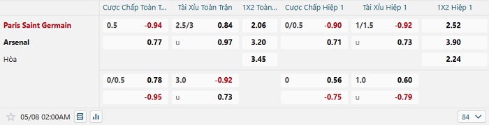 Bảng tỷ lệ kèo nhà cái PSG vs Arsenal