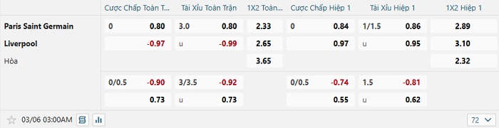 Bảng tỷ lệ kèo bóng đá PSG vs Liverpool
