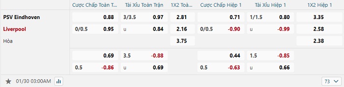 Bảng tỷ lệ kèo bóng đá PSV Eindhoven vs Liverpool